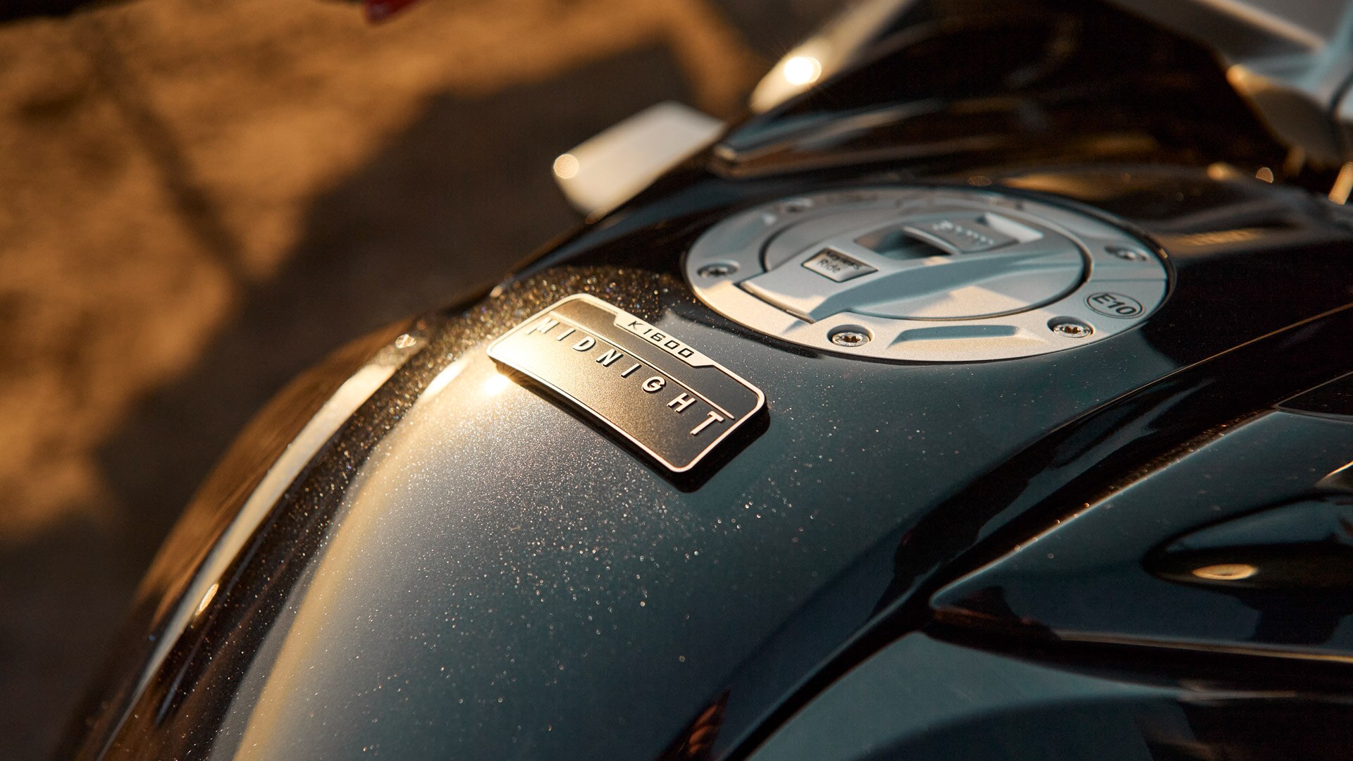 Naast het lakwerk biedt de Option 719 Midnight nog andere exclusieve uitrustingskenmerken: Op de tankmiddencover zit het hoogwaardige, van aluminium gemaakte plaatje Midnight. De zwarte Option 719 buddyseat heeft een wolkenprint en de modelnaam als opschrift. De windschermpanelen en stuurgewichten zijn in zwart uitgevoerd. En het voorspatbord, de windgeleiders en de tankmiddencover vallen op door Meteoric Dust II metallic: Exclusiviteit tot in de puntjes.